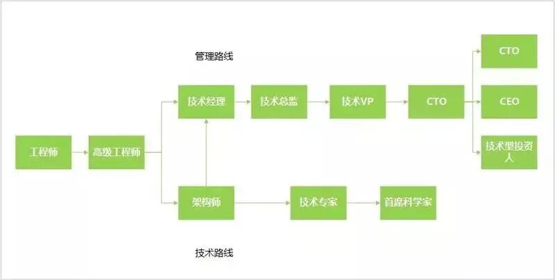 先贴一张技术人员职业发展路线图,按照管理路线和技术路线区分。在国外管理路线和技术路线的职位会按照 IT Manager 和 TechLead 去区分。