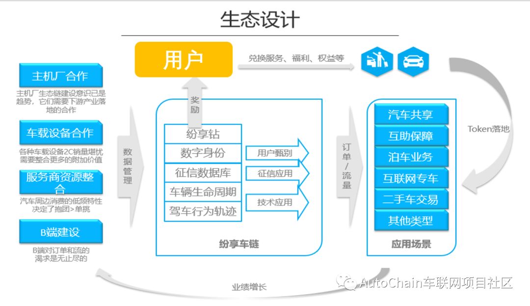 纷享车链AutoChain无疑是服务于汽车类出行行业相关领域,若以一个更为宏观的视角来看其生态体系构建,作为一个去中心化组织,纷享车链通过用户各类数据的应用,并整合汽车类出行行业资源,配合各个汽车类出行行业服务商共同建设出行行业的Token经济模型。其设计思路为:通过征信->奖励->应用->流通的模型鼓励消费者参与其中,共建基于信任的出行行业生态,从而提升消费者的消费体验,亦通过经济模型帮助服务商更高效的触达和服务高质量用户,由此实现平台的多方共赢。对于用户来说,token不但本身就具备一定的投资价值;且据其白皮书介绍,token同时也可以进行商户服务优惠的兑换。由此一来,商家为了吸引高征信用户,会通过各种商家工具向用户发放其他类型的token;再以token兑换的形式,用以吸引优质客户群体,用户的数据资源得以最大化的体现,从而提升用户的消费体验。