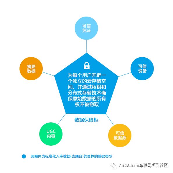 这种“去中心化”的技术实现方式也就是区块链的核心特征之一。大家可以把数据保险柜比作银行机构中的资产保险柜,而用户的数据亦如同有形资产蕴藏着巨大的价值,因此需要很好的保存与保护。但是无论是银行,还是云存储服务商,它们都是中心化的机构或组织,并不能保证用户的隐私数据不被泄露,因为保管数据的那把“钥匙”并非掌握在用户自己手中。数据保险柜不同于中心化的数据库,它的本质在于将链上数据的控制权完全交给用户本人,数据只有在用户通过私钥授权的情况下才可以访问和获得。那我们来了解一下哪些数据可以被采集至数据保险柜中。根据官方解释,数据保险柜中的标准数据源分为以下这五类:分别是可信凭证,包括诸如公民身份证、驾驶证、行驶证等日常证件信息;可信设备,该类数据包括但不限于汽车OBD设备、行车记录仪、智能手表等;可信数据源,该类数据包括但不限于电商平台、征信平台、账单平台等;UGC(User Generated Content)内容,包括用户上传或发布的各类诸如服务体验、售后维权等内容信息;摘要数据,指平台利用内置的算法引擎对用户在保险柜中的离散数据进行归集摘要,并把摘要结果重新上传至保险柜中。到这里我们可以说,纷享车链AutoChain首创的数据保险柜借助了区块链技术,确保数据安全的同时把数据的控制权交给用户本人,使用户真正成为数据的主人。
