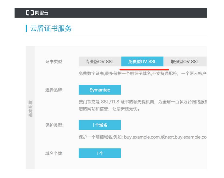 免费证书:阿里云上的 赛门铁克 免费型DV SSL