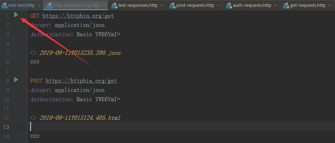 IntelliJ IDEA 自动将最近执行的 50 个请求保存到http-requests-log.http 文件中,该文件存储在项目的 .idea / httpRequests / 目录下。使用请求历史记录,您可以快速导航到特定响应并再次发出请求。文件内容大如下图所示,再次发出请求只要点击那个运行按钮即可。如果从请求历史记录再次发出请求,则其执行信息和响应输出的链接将添加到请求历史记录文件的顶部。