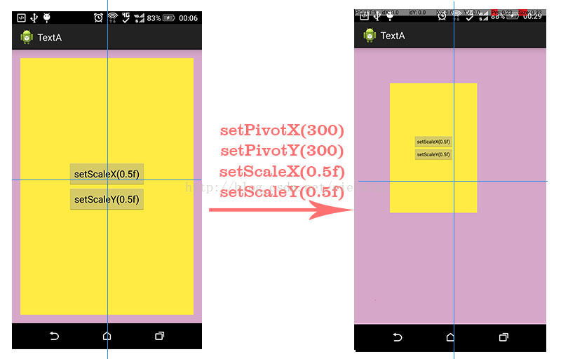 上面还提到了两个方法,分别是setPivotX()和setPivotY(),其他是用来设置缩放操作的锚点坐标的。以像素为单位,它的默认值是View的中心坐标。