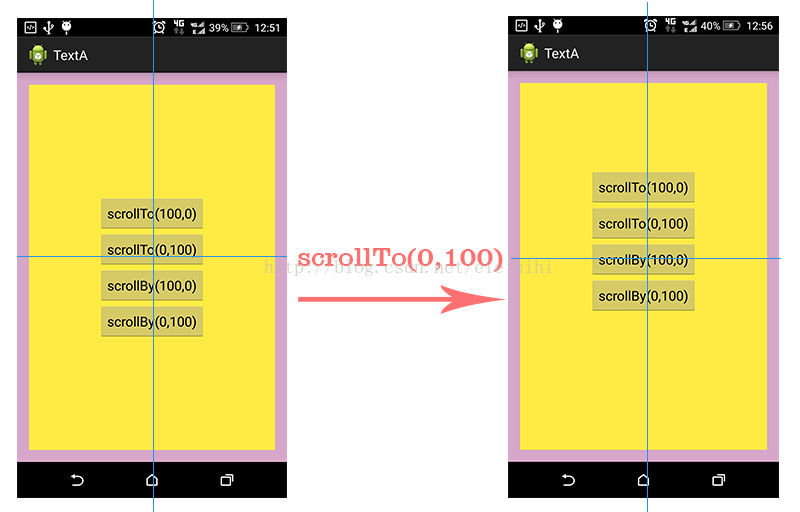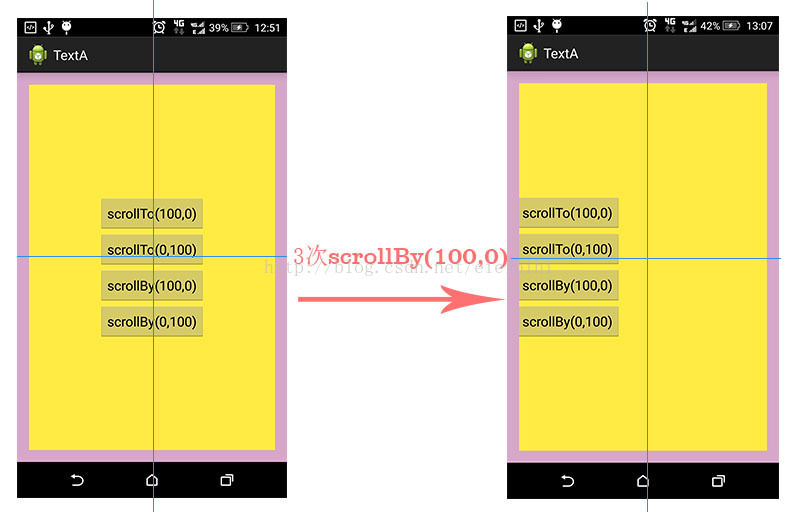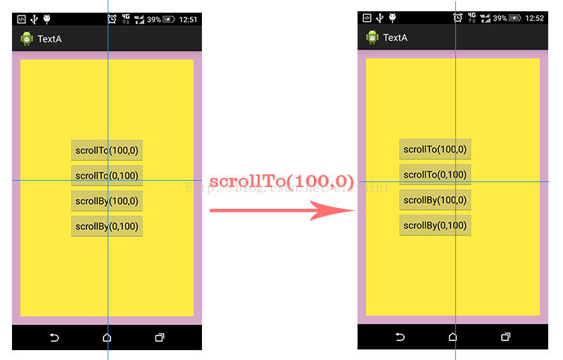 从上面的例子中,不管你调用多少次scrollTo(100,0),其最终效果都只是让mScrollX=100,mScrollY=0。也就是说,该方法重复调用,只有一次效果。