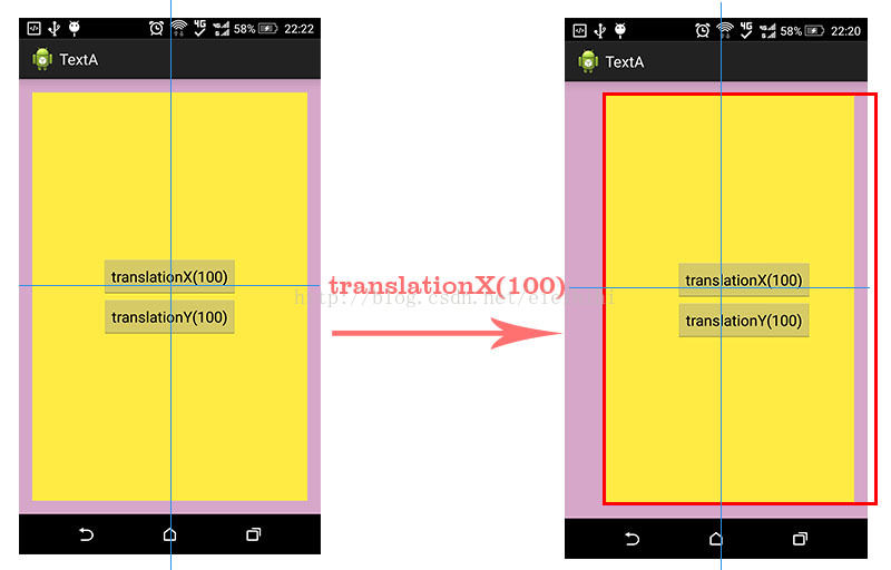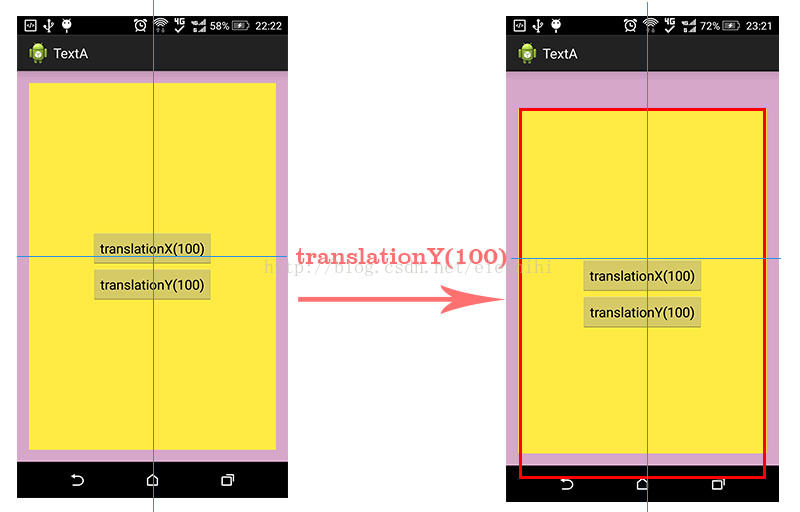 黄色View调用了setTranslationX(100)之后,水平偏移量为100,整个黄色View从左往右移动了100像素。