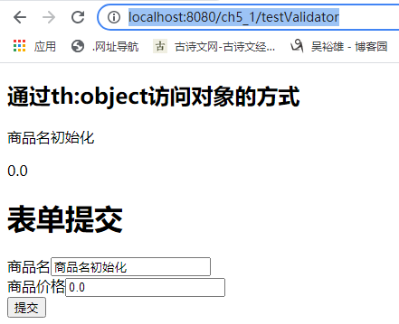 创建控制器 应用的com.ch.ch5_1.controller包中,创建控制器类TestValidatorController。在该类中有两个处理方法,一个是界面初始化处理方法testValidator,一个是添加请求处理方法add。在add方法中,使用@Validated注解使验证生效。 @RequestMapping(value="/add") public String add(@ModelAttribute("goodsInfo") @Validated Goods goods,BindingResult rs){ //@ModelAttribute("goodsInfo")与th:object="${goodsInfo}"相对应 if(rs.hasErrors()){//验证失败 return "testValidator"; } //验证成功,可以到任意地方,在这里直接到testValidator界面 return "testValidator"; }