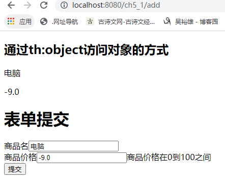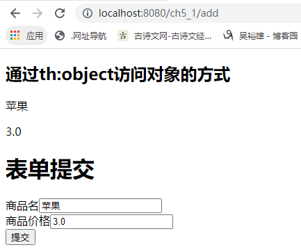 <!DOCTYPE html> <html xmlns:th="http://www.thymeleaf.org"> <head> <meta charset="UTF-8"> <title>Insert title here</title> </head> <body> <h2>通过th:object访问对象的方式</h2> <div th:object="${goodsInfo}"> <p th:text="*{gname}"></p> <p th:text="*{gprice}"></p> </div> <h1>表单提交</h1> <!-- 表单提交用户信息,注意表单参数的设置,直接是*{} --> <form th:action="@{/add}" th:object="${goodsInfo}" method="post"> <div><span>商品名</span><input type="text" th:field="*{gname}"/><span th:errors="*{gname}"></span></div> <div><span>商品价格</span><input type="text" th:field="*{gprice}"/><span th:errors="*{gprice}"></span></div> <input type="submit" /> </form> </body> </html>