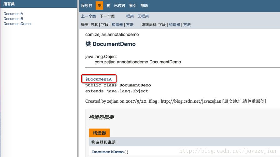 可以发现使用@Documented元注解定义的注解(@DocumentA)将会生成到javadoc中,而@DocumentB则没有在doc文档中出现,这就是元注解@Documented的作用。