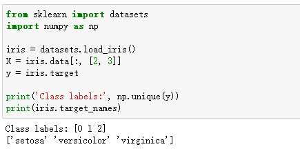 鸢尾花数据集可以从scikit-learn库中直接加载,其中X的第三列代表花瓣长度(petal length),第四列代表花瓣宽度(petal width),Y代表的类别已被转为整数:0=Iris-Setosa(山鸢尾),1=Iris-Versicolor(杂色鸢尾),2=Iris-Virginica(维尔吉妮卡鸢尾)。