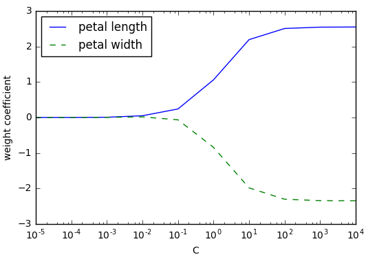 可以看出随着C的增大(即正则化系数λ越来越小),对于模型系数复杂度的惩罚越来越小,模型系数也由0逐渐变得显著(绝对值增大)。
