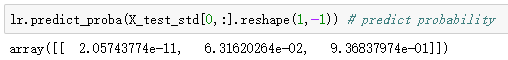 上面数组第一行的3个数值分别代表测试集中第一条特征数据对应的三种鸢尾花的预测概率:0=Iris-Setosa(山鸢尾),1=Iris-Versicolor(杂色鸢尾),2=Iris-Virginica(维尔吉妮卡鸢尾)。