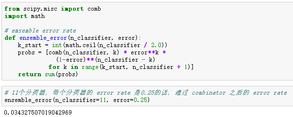假设我们组合了 n 个分类器,它们的错误率都为 εε , 各个分类器之间独立。