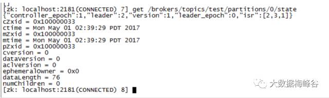 [zk: localhost:2181(CONNECTED) 23] get /brokers/topics/mykafka4/partitions/1/state