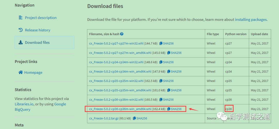 1、进入cxfreeze官网,这里我下载的是py36对于的cxfreeze 64位版本,如下图