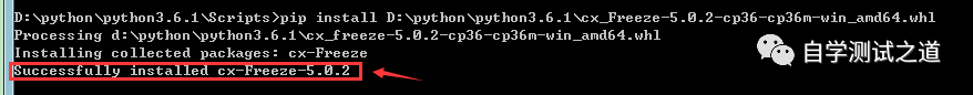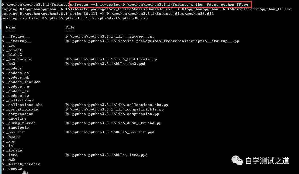 这里输入:cxfreeze --init-script=D:pythonpython3.6.1Scriptspython_ff.py python_ff.py,然后按回车键即可看到打包过程