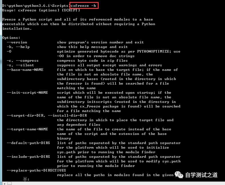 3、查看cxfreeze是否还提示不是内部或外部命令的错误,在cxfreeze目录下输入cmd,执行指令:cxfreeze -h,提示如下图即成功