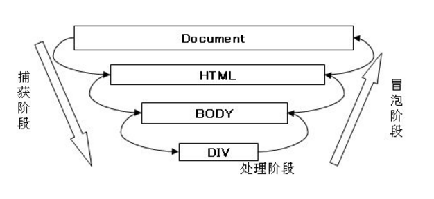 DOM2.0 模型将事件处理流程分为三个阶段,即 事件捕获阶段 、 事件处理阶段 、 事件冒泡阶段, 如图所示: