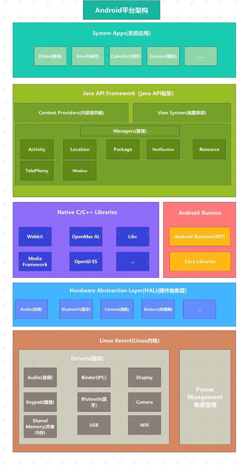 所以我们要对Android的整体架构有清晰的认识,用来帮助我们去构建Android的"网",下面是我自己做的一张架构图