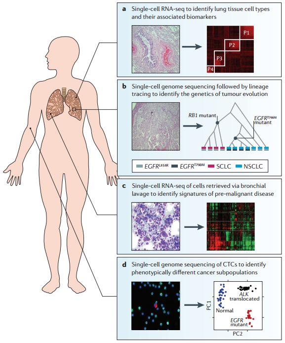 2、在Nat Rev Cancer杂志上2018.8月份发表的综述主要从单细胞测序在肿瘤研究中的应用来展开,综述了单细胞测序的技术、在研究肿瘤异质性和基因组进化中的作用,并以肺癌为例说明了单细胞测序的应用场景: