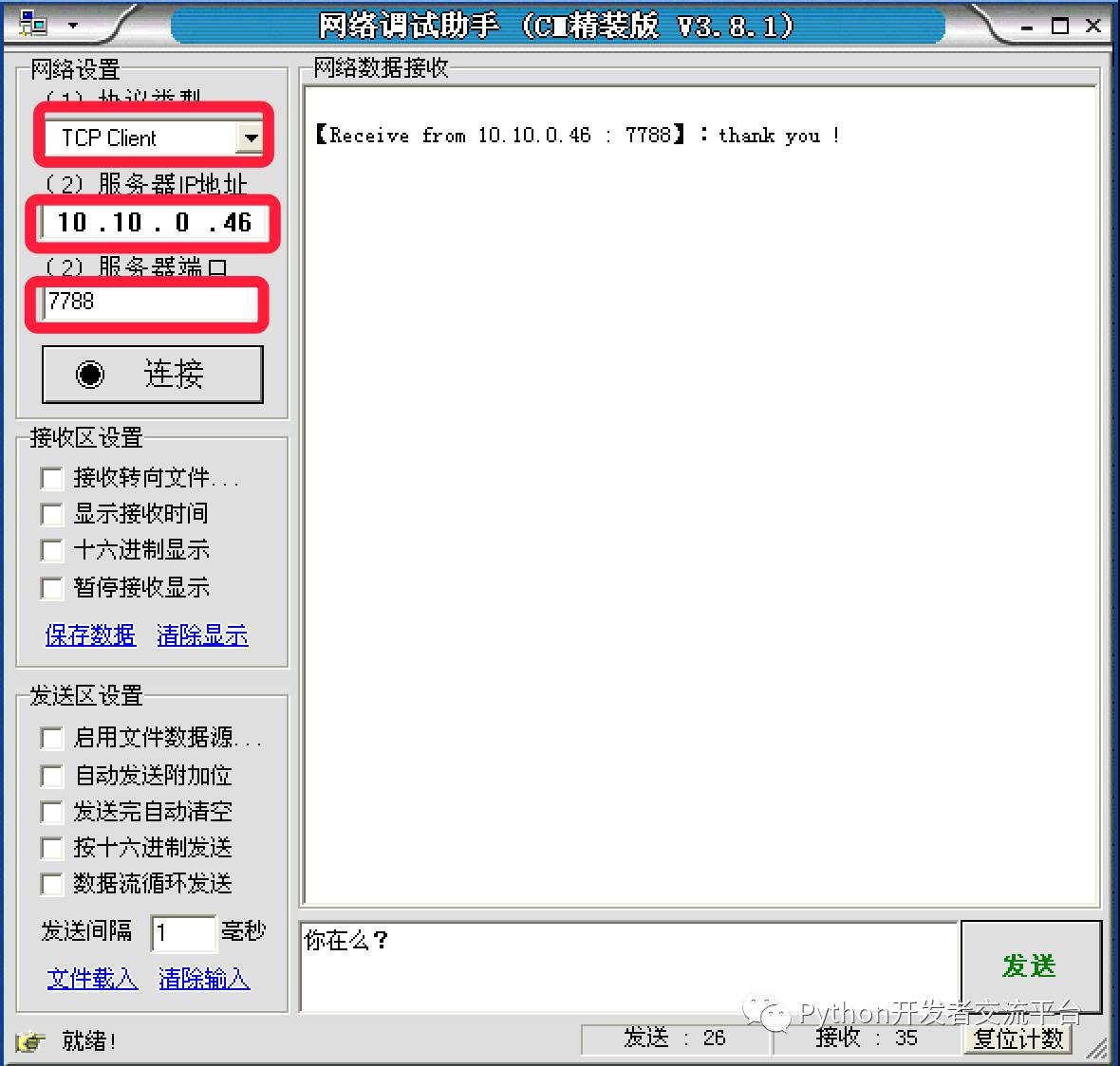 from socket import *# 创建sockettcp_server_socket = socket(AF_INET, SOCK_STREAM)# 本地信息address = ('', 7788)# 绑定tcp_server_socket.bind(address)# 使用socket创建的套接字默认的属性是主动的,使用listen将其变为被动的,这样就可以接收别人的链接了tcp_server_socket.listen(128)# 如果有新的客户端来链接服务器,那么就产生一个新的套接字专门为这个客户端服务# client_socket用来为这个客户端服务# tcp_server_socket就可以省下来专门等待其他新客户端的链接client_socket, clientAddr = tcp_server_socket.accept()# 接收对方发送过来的数据recv_data = client_socket.recv(1024) # 接收1024个字节print('接收到的数据为:', recv_data.decode('gbk'))# 发送一些数据到客户端client_socket.send("thank you !".encode('gbk'))# 关闭为这个客户端服务的套接字,只要关闭了,就意味着为不能再为这个客户端服务了,如果还需要服务,只能再次重新连接client_socket.close()