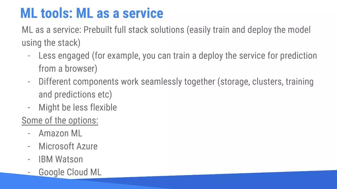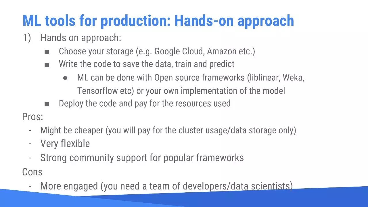 动手实践:选择存储工具(如 Google Cloud,Amazon 等);为存储数据、训练和预测编码;可以使用开源框架(liblinear,Weka,Tensorflow 等)或自己的实现模型;