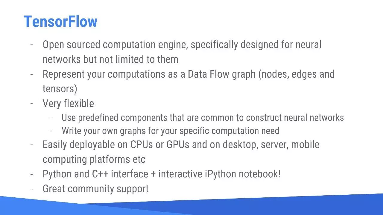 上面说完了谷歌机器学习的实用技巧,也正好说到了 TensorFlow——代表谷歌深度学习的开源框架。现在,开源深度学习框架越来越多,除了 TensorFlow,目前可选的就有 Theano + Lasagne / Keras,Torch,PyTorch,Mxnet / minpy,Chainer,Neon,CNTK,Caffe 和 dynet。