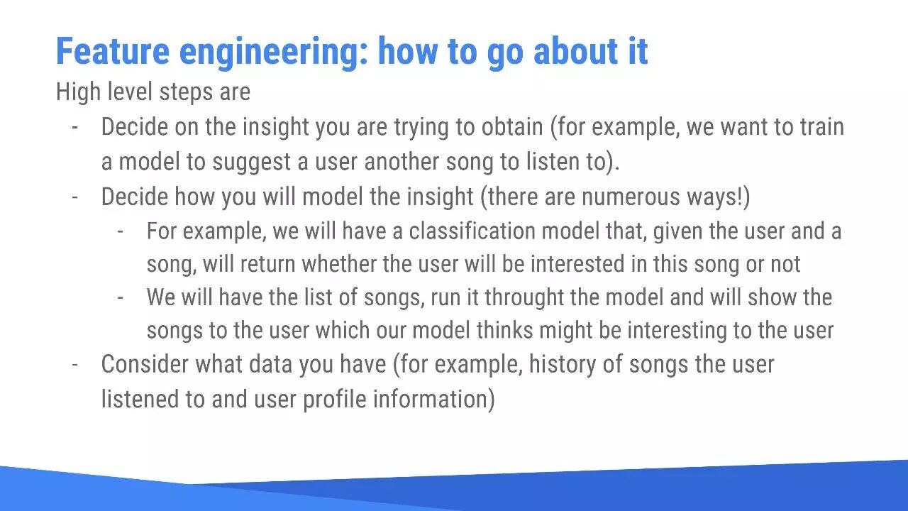 决定如何建模(有许多方法!) .例如,建一个分类模型,给定用户和歌曲,模型将返回用户是否会对这首歌感兴趣的结果。或者我们有一个歌曲列表,把它给模型运行,模型将显示它认为用户可能会喜欢的歌曲。
