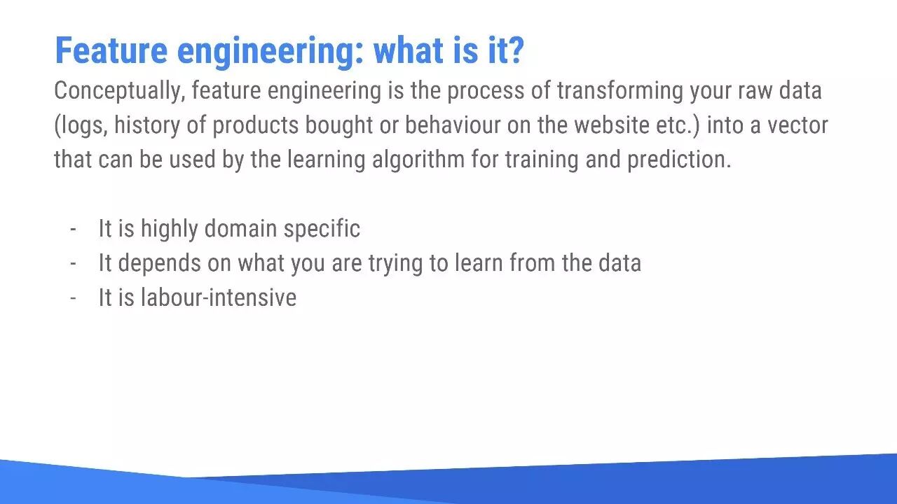 在概念上,特征工程是将原始数据(日志,产品购买的历史记录或上网行为等)转换成可以由学习算法在训练和预测中使用的矢量(vector)的过程。