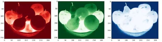 举例来说,可以将任意一张RGB彩色图片表示成一个三阶张量,三个维度分别是图片的高度、宽度和色彩数据。下图如果按照RGB三原色表示,就可以拆分为三张红色、绿色和蓝色的灰度图片(见下图中间的三张不同突破),再将这张图用张量表示出来,就是最下方的那张表格。