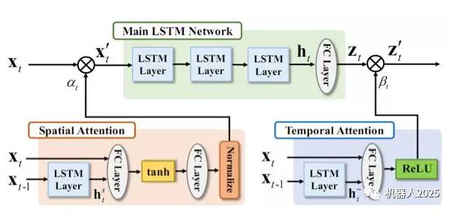 空域注意力:对于行为动作的判别,是不是每个关节点在动作判别中都同等重要呢?研究证明,一些行为动作会跟某些关节点构成的集合相关,而另一些行为动作会跟其它一些关节点构成的集合相关。比如“打电话”,主要跟头、肩膀、手肘和手腕这些关节点密切相关,同时跟腿上的关节点关系很小,而对“走路”这个动作的判别主要通过腿部节点的观察就可以完成。与此相适应,我们设计了一个LSTM子网络,依据序列的内容自动给不同关节点分配不同的重要性,即给予不同的注意力。由于注意力是基于内容的,即当前帧信息和历史信息共同决定的,因此,在同一个序列中,关节点重要性的分配可以随着时间的变化而改变。