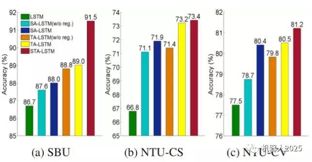空时注意力模型能带来多大的好处呢?我们在SBU 数据库、NTU RGB+D 数据库的Cross Subject(CS) 和 Cross View(CV) 设置上分别进行了实验,以检测其有效性。图1.3展示了性能的比较:LSTM表示只有主LSTM网络时的性能(没引入注意力模型)。当同时引入时域注意力(TA)和空域注意力(SA)网络后,如STA-LSTM所示,识别的精度实现了大幅提升。