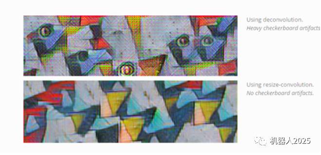 这篇文章指出了转置卷积的一些问题,认为转置卷积由于不合理的重合,使得生成的图片总是有“棋盘状的噪声点”,它提出使用先将图片放大,再做卷积的方式来代替转置卷积做上采样,可以提高生成图片的质量,下图为两种方法的对比: