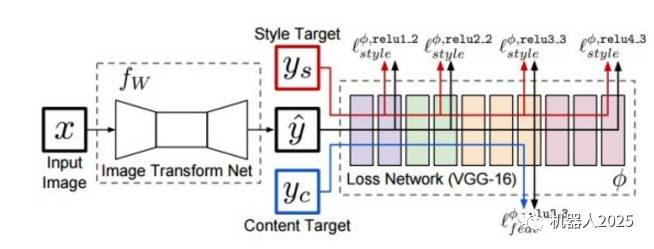 训练阶段:首先选定一张风格图片。训练的目标是让生成网络可以有效生成图片。目标由损失网络定义。