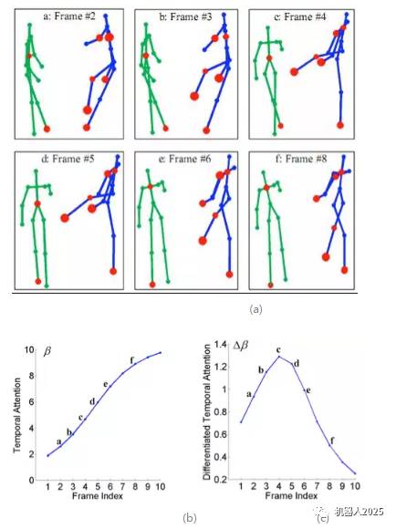 细心的读者可能已经发现,序列中的空域注意力和时域注意力具体为多大是没有参考的(不知道Groundtruth)。网络是以优化最终分类性能来自动习得注意力。那么,学到的注意力模型分配的注意力数值是什么样呢?我们可视化并分析了空时注意力模型的输出。图1.4可视化了在 “挥拳”行为动作的测试序列上,模型输出的空域注意力权重的大小,时域注意力权重值 以及相邻帧时域注意力的差值。如图1.4(a)中所示,主动方(右侧人)的节点被赋予了更大的权值,且腿部的节点更加活跃。图(b)展示了时域注意力的变化,可以看到,时域注意力随着动作的发展逐渐上升,相邻帧时域注意力差值的变化则表明了帧间判别力的增量。时域注意力模型会对更具判别力的帧赋予较大的注意力权重。对不同的行为动作,空间注意力模型赋予较大权重的节点也不同,整体和人的感知一致。