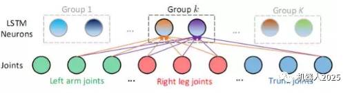 在训练阶段,我们在目标函数中引入对关节点和神经元相连的权重的约束,使同一组的神经元对某些关节点组成的子集有更大的权重连接,而对其他节点有较小的权重连接,从而挖掘关节点的共现性。如图2.2所示,一个LSTM 层由若干个LSTM神经元组成,这些神经元被分为K组。同组中的每个神经元共同地和某些关节点有更大的连接权值(和某类或某几类动作相关的节点构成关节点子集),而和其他关节点有较小的连接权值。不同组的神经元对不同动作的敏感程度不同,体现在不同组的神经元对应于更大连接权值的节点子集也不同。在实现上,我们通过对每组神经元和关节点的连接加入组稀疏(Group Sparse)约束来达到上述共现性的挖掘和利用。
