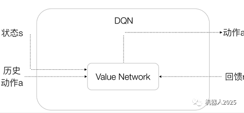 在DQN中,用一个价值网络(Value Network)来表示Critic评判模块,价值网络输出Q(s,a),即状态s和动作a下的价值。基于价值网络,我们可以遍历某个状态s下各种动作的价值,然后选择价值最大的一个动作输出。所以,主要问题是如何通过深度学习的随机梯度下降方法来更新价值网络。为了使用梯度下降方法,我们必须为价值网络构造一个损失函数。由于价值网络输出的是Q值,因此如果能够构造出一个目标Q值,就能够通过平方差MSE的方式来得到损失函数。但对于价值网络来说,输入的信息仅有状态s,动作a及回馈r。因此,如何计算出目标Q值是DQN算法的关键,而这正是增强学习能够解决的问题。基于增强学习的Bellman公式,我们能够基于输入信息特别是回馈r构造出目标Q值,从而得到损失函数,对价值网络进行更新。