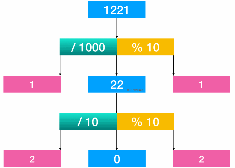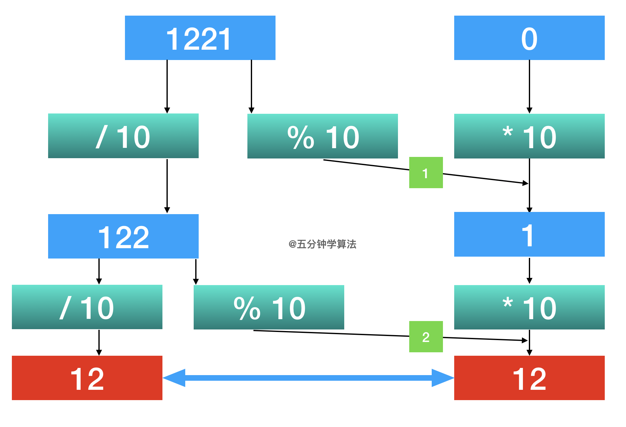 x是不是小于revertNum,当它小于的时候,说明数字已经对半或者过半了 - 最后,判断奇偶数情况:如果是偶数的话,revertNum 和 x 相等;如果是奇数的话,最中间的数字就在revertNum 的最低位上,将它除以 10 以后应该和 x 相等。