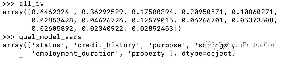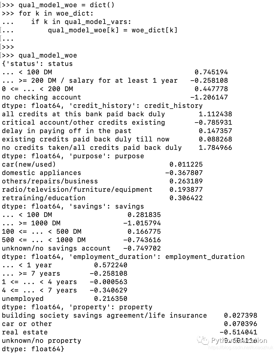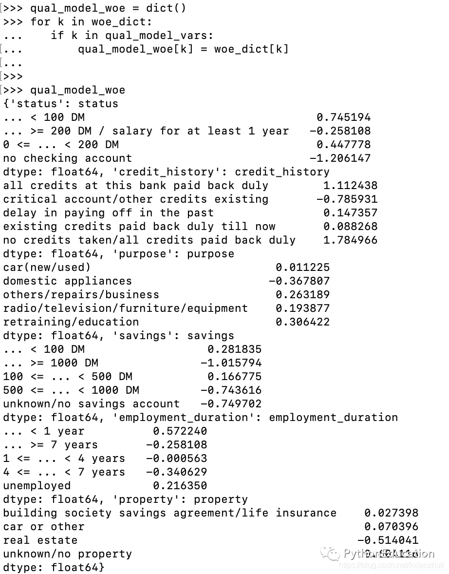 定性指标的筛选可通过计算IV值,并选择IV值大于某一数值的条件来筛选指标,此处自己实现了WOE和IV的函数计算,本文选择了IV值大于0.1的指标,算是比较高的IV值了,一般大于0.02就算是好变量