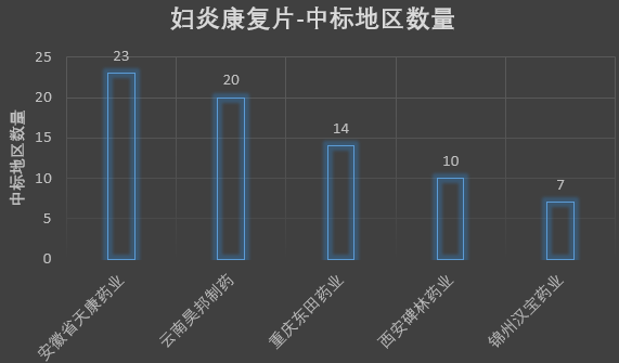 安徽省天康药业,云南昊邦制药,重庆东田药业,西安碑林药业,锦州汉宝药业为妇炎康复片的主要投标公司。安徽省天康药业在23个地区中标,排名第一;云南昊邦制药在20个地区中标,排名第二;重庆东田药业在14个地区中标,排名第三;西安碑林药业在10个地区中标,排名第四;锦州汉宝药业在7个地区中标,排名第五。