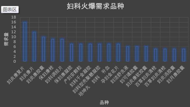 上图中,妇炎康复片、妇炎康片、妇炎康胶囊、保妇康栓、妇科调经片、保护康凝剂、产妇安颗粒、妇科千金凝胶、培坤丸、孕妇金花片妇洁舒洗液等药物代理需求量较大。