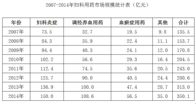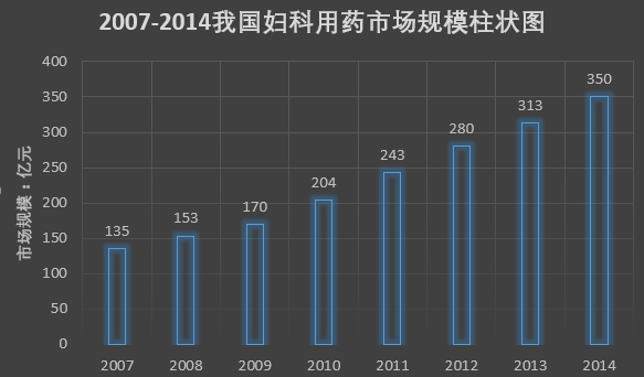 下图中,2007年-2014年我国妇科用药市场规模走势逐年增加,呈增函数趋势发展。从2007年到2014年,妇科用药市场规模扩大了几乎两倍。