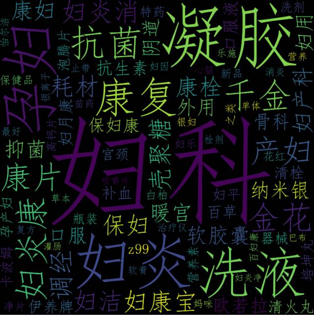 从上图中可以看到,洗液、抗菌、调经、暖宫、阴道、抗生素、补血、清火丸、宫颈、等字体较大,属于妇科类的二级火爆品种。