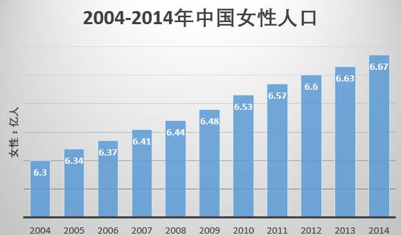 下图中,2004年-2014年中国女性人口总数占人口逐年增加,呈增函数趋势发展。