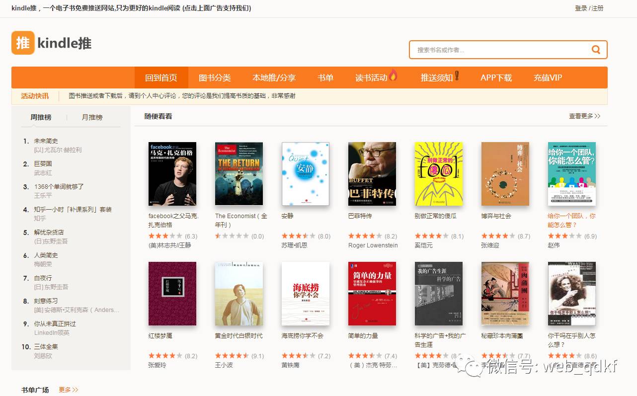适合kindle用户,是一个站长为分享kindle电子书专门建立的网站,可在线阅读,也可下载epub或mobi格式,亦可推送至kindle。