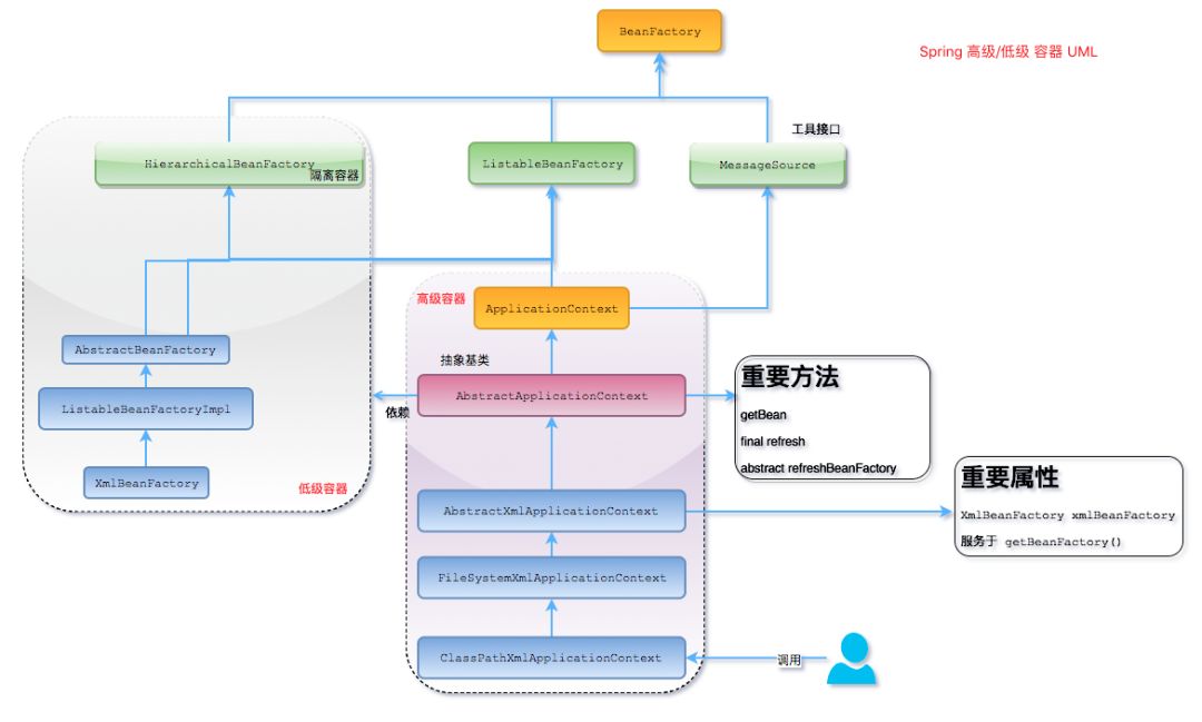 看下面的隶属 ApplicationContext 粉红色的 “高级容器”,依赖着 “低级容器”,这里说的是依赖,不是继承哦。他依赖着 “低级容器” 的 getBean 功能。而高级容器有更多的功能:支持不同的信息源头,可以访问文件资源,支持应用事件(Observer 模式)。