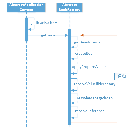 假设:当 Bean_A 依赖着 Bean_B,而这个 Bean_A 在加载的时候,其配置的 ref = “Bean_B” 在解析的时候只是一个占位符,被放入了 Bean_A 的属性集合中,当调用 getBean 时,需要真正 Bean_B 注入到 Bean_A 内部时,就需要从容器中获取这个 Bean_B,因此产生了递归。