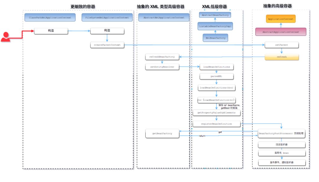 左边灰色区域的是 “低级容器”, 只负载加载 Bean,获取 Bean。容器其他的高级功能是没有的。例如上图画的 refresh 刷新 Bean 工厂所有配置。生命周期事件回调等。