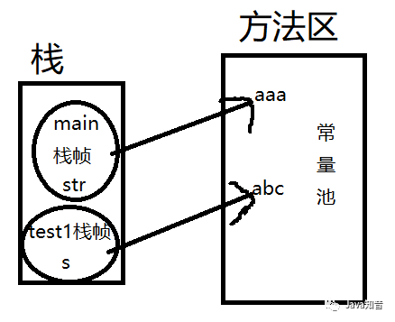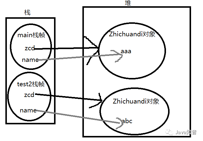 原因:其实也是值传递还是引用传递的问题。具体核心原因:main函数的str引用和zcd在栈上,而其对应的值在方法区或堆上。test1、test2、test3的参数也在栈上,这个空间和main上的不是同一块,是不同的栈帧。所以你修改test方法的数据对于main函数其实是无感知的。但是对象的引用的话修改的是堆内存中的对象属性值,所以有感知,那为什么test2输出的是aaa而不是abc呢?因为test2把堆中的对象都给换了,重新生成一个全新对象,对main上的引用来讲是看不到的,具体如下三幅图: