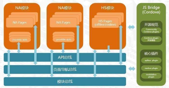 开发框架应对API总线、页面导航总线、模块总线这些核心能力提供了cordova插件的实现,使H5页面也能够轻松的调用这些api,并且做到NA与H5调用无差异化。