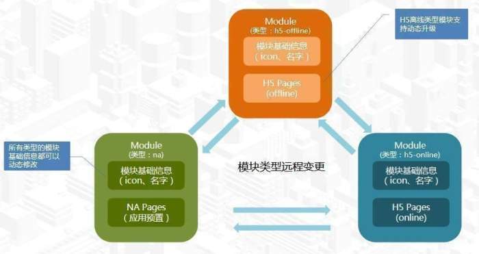 App开发框架应以模块化设计为基础,同时打通NA与H5两种不同技术实现的业务。模块主要分为两种形态: