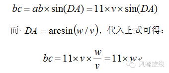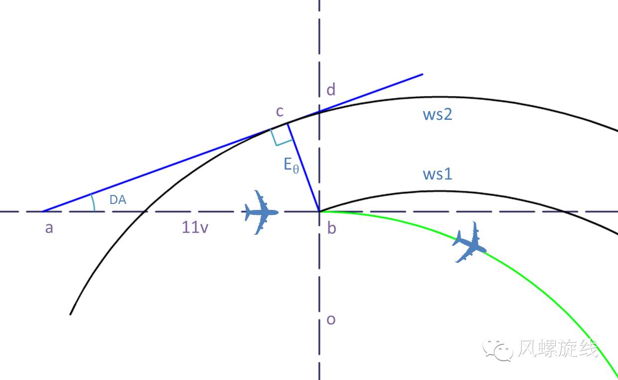 图中bd垂直于ab,bc垂直于ac,故bd与bc的夹角等于DA。也就是说,从转弯起点(b)开始,向后偏转弯一个偏流角(DA),之后直接外扩11w,或是将11w换算成角度,将ws1逆向旋转该角度,得到ws2,ws2风螺旋线与前一段的最大偏航航迹(ac)相切,切点位于c点位置。